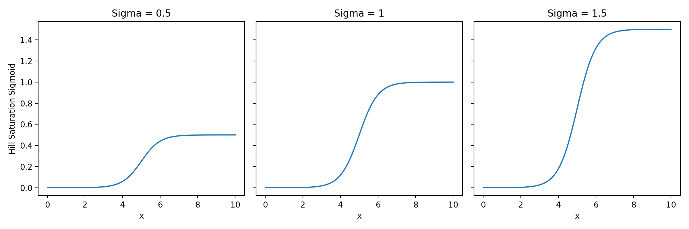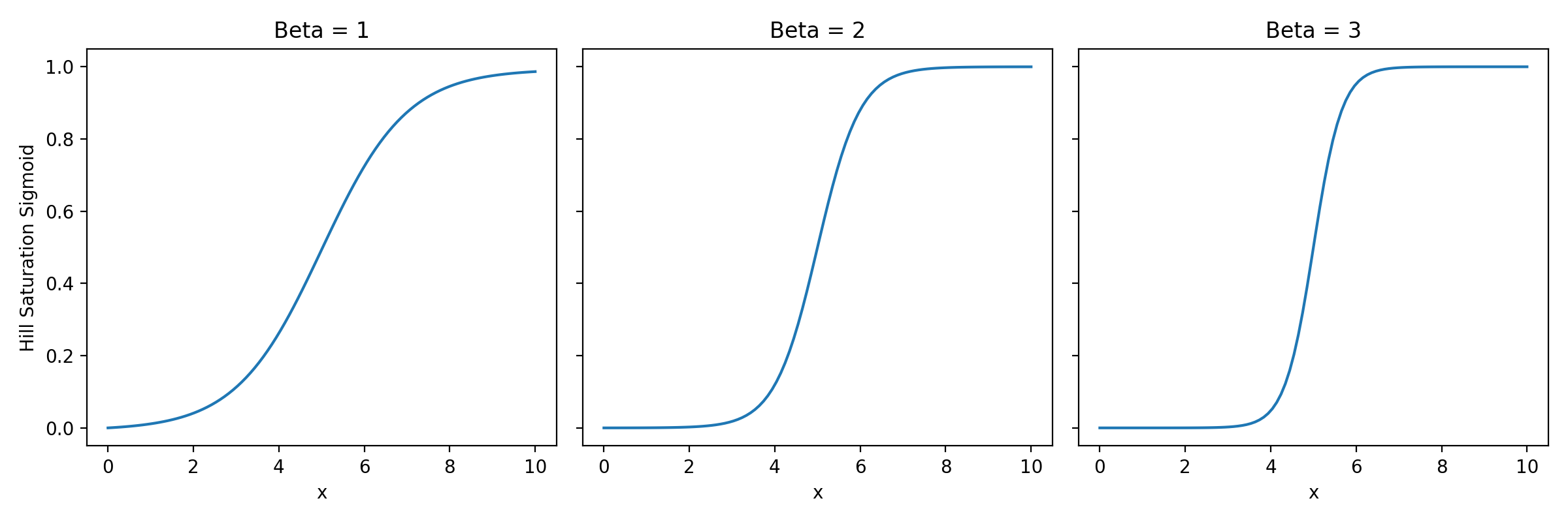 This function computes the Hill sigmoidal response curve, which is commonly used to describe the saturation effect in biological systems. The curve is characterized by its sigmoidal shape, representing a gradual transition from a low, nearly zero level to a high plateau, the maximum value the function will approach as the independent variable grows large. In this implementation, we add an offset to the sigmoid function to ensure that the function always passes through the origin as we expect zero spend to result in zero contribution.